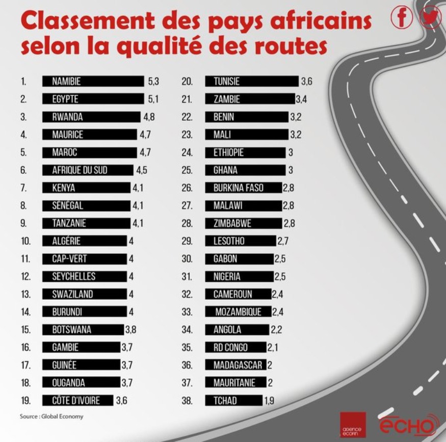 Selon Global Economy la qualité des routes en #Afrique, 1 (faible) - 7 (élevée) : la moyenne pour 2019 basée sur 38 pays était de 3,43 points, la valeur la plus élevée en Namibie: 5,3 points et la valeur la plus basse au Tchad: 1,9 point.