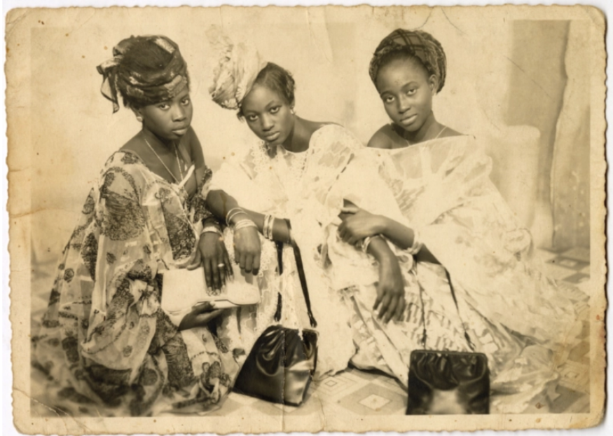 Une photo de 1956/1957 de Seydou Keïta représente deux femmes assises contre un imprimé tourbillonnant, presque mod, les robes élaborées des femmes coupées dans un tissu imprimé et texturé, leurs cheveux ornés de perles et d’enveloppements. Leurs poignets droits arborent un brassard et leur gauche une montre de bonne taille de style européen. La femme de gauche semble légèrement plus âgée et porte une bande de mariage; elle ne sourit pas pour la caméra. La femme de droite – sa fille ? Une seconde épouse ? Une sœur ? – semble plus détendue, et un sourire orne son visage.