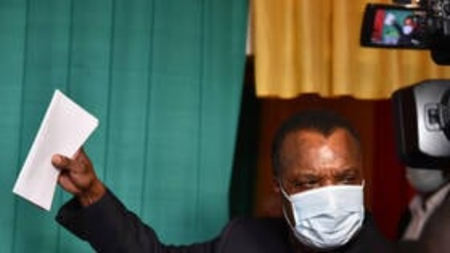 Le président sortant Denis Sassou Nguesso montre son bulletin de vote avant de le déposer dans un bureau de vote à Brazzaville, en République du Congo, le 21 mars 2021. | OLIVIA ACLAND / REUTERS