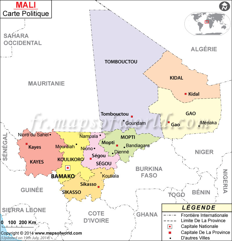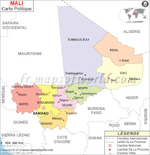 Le Mali est un pays d’Afrique de l’Ouest qui s’étend sur un très vaste territoire d’une superficie d’un million deux cent quarante un mille kilomètres carrés (exactement 1 241 238 Km²). Cette superficie correspond au double de celle de la France, plus du double de celle du Cameroun, plus du triple de celle de l’Allemagne et plus de 100 fois celle du Qatar. Le Nord du Pays est désertique et plus on va vers le Sud, plus on passe progressivement d’une végétation de type steppe, puis de la savane et enfin de la forêt au sud. Les principales villes sont: Bamako, Kayes, Segou, Sikasso au Sud ; Tombouctou et Mopti au centre, Gao, Kidal et Taoudeni au Nord.