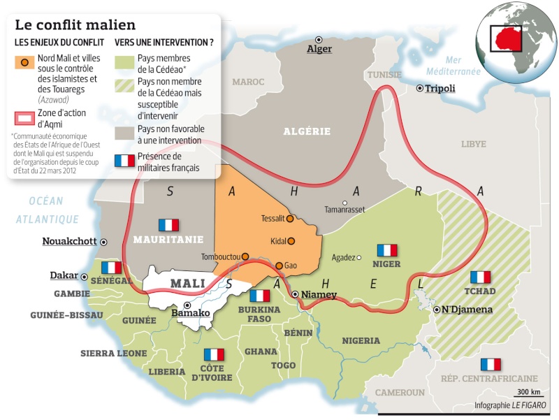 Après la chute du régime libyen de Mouammar Kadhafi, des soldats sahéliens touaregs et tchadiens qui combattaient dans son armée se replient dans la zone désertique du Sahel, vers leurs pays. Des groupes armés islamistes salafistes djihadistes du réseau terroriste Ansar Dine s’allient au mouvement indépendantiste du MNLA (Mouvement National de Libération de l’Azawad) et déclenchent la guerre de conquête du Mali. Ils sont rejoints par les terroristes d’AQMI (Al-Qaida au Maghreb Islamique) et du MUJAO. Toutes les villes de l’extrême-nord du Mali sont attaquées dès janvier 2012 et rapidement conquises : Aguel'hoc, Ménaka et Tessalit. Cette succession de défaites militaires entraîne une tentative de Coup d’Etat en mars 2012 du Capitaine Amadou Sanogo contre le président Toumani Touré. Les assaillants profitent du chaos causé par le putsch dans l’Etat Malien pour s’emparer de Kidal, et Gao, les principales villes au nord du Mali. L’offensive se poursuit plus au sud et la ville de Tombouctou est également conquise. Le 6 avril 2012, le MNLA estimant que le territoire de l’Azawad qu’il réclame comme nation touarègue est conquis, il annonce la fin de son offensive et proclame l’indépendance de l’Azawad. Un conflit armé éclate ensuite entre les différents groupes en lutte contre l’Etat malien. En janvier 2013, les groupes armés terroristes islamistes djihadistes lancent une vaste attaque vers le sud du Mali et notamment vers les villes de Ségou et Mopti. Mopti est considéré comme une ville verrou. Au cas où elle serait conquise par les djihadistes, la capitale Bamako et l’ensemble du Mali serait également conquis. Ce risque majeur sur l’existence même de l’Etat malien entraîne l’entrée en guerre de la France pour la reconquête du Mali en janvier 2013. C’est l’opération Serval.