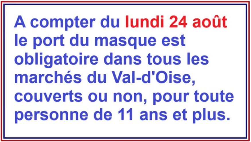 Le port du masque devient obligatoire dans tous les marchés du Val-d'Oise, couverts ou non. Cette mesure s'appliquera à compter du 24 août 2020, pour une durée de 1mois, et concerne toutes les personnes âgées de 11 ans et plus.