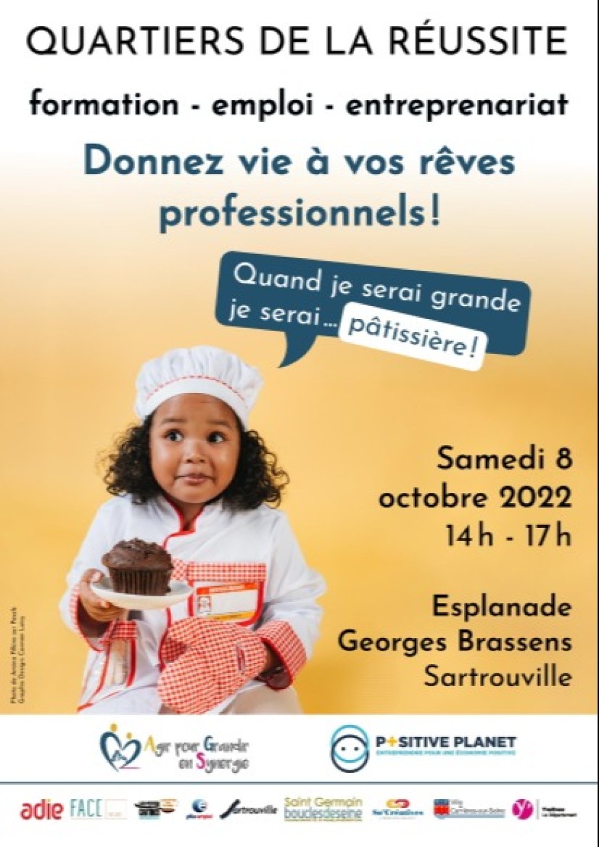Venez rencontrer les professionnels de l’entreprenariat le 8 octobre 2022, de 14h00 à 17h00 à Sartrouville, sur l’Esplanade Georges Brassens à l’occasion de la 1ère édition des Quartiers de la Réussite. Cet évènement est organisé conjointement par AGS et Positive Planet. Venez nombreux et parlez-en autour de vous !
