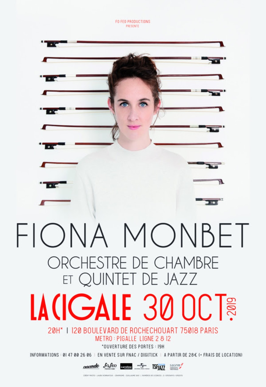 La violoniste Fiona Monbet dévoilera le 30 octobre à la Cigale sa nouvelle création en compagnie d'un orchestre de chambre et d'un quintet de jazz. Cette création de Fiona Monbet mêle écriture et improvisation en une grande forme lumineuse et ouverte : un quartet de jazz, un guitariste folk irlandais, et un orchestre symphonique d'une vingtaine de musiciens.