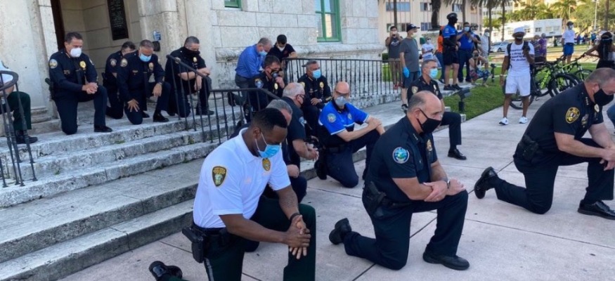 While smoke bombs go off at the #MIAMIPROTEST, at the Coral Gables #GeorgeFloydprotest earlier today, police take a knee in solidarity. Photo by @SunSentinel's Mike Stocker: