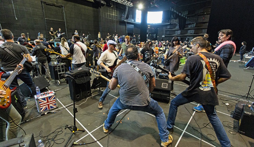 Le Stade de France ne sera pas le seul à se bercer de gigantisme en cette fin du mois de juin. Le 23, quelque 1 000 musiciens et chanteurs du concert en plein air We Love Rock'n Roll se déploieront sur l'aire du pré du Bel-Ébat, à Évreux, pour une prestation inspirée elle aussi par l'expérience transalpine de Rockin'1000. À la différence du concert parisien, pour lequel les artistes ont dû passer des auditions, We Love Rock'n Roll est ouvert à tous, chanteurs, guitaristes, bassistes, batteurs et claviéristes. « Cet événement se veut avant tout un projet participatif. Sa vocation est de rassembler sur tout le département de l'Eure », explique Alban Legrand, directeur délégué aux musiques actuelles du Tangram, un établissement culturel public pluridisciplinaire, à l'origine de la manifestation. Pour recruter et préparer les amateurs, lors de quatre sessions de répétition organisées dans plusieurs lieux du département, de nombreuses structures ont été mobilisées : conservatoire d'Évreux, écoles de musique et MJC. Ce sont d'ailleurs les écoles de musique qui ont choisi le répertoire, en intégrant parfois la liste des titres choisis au cursus de l'année.
