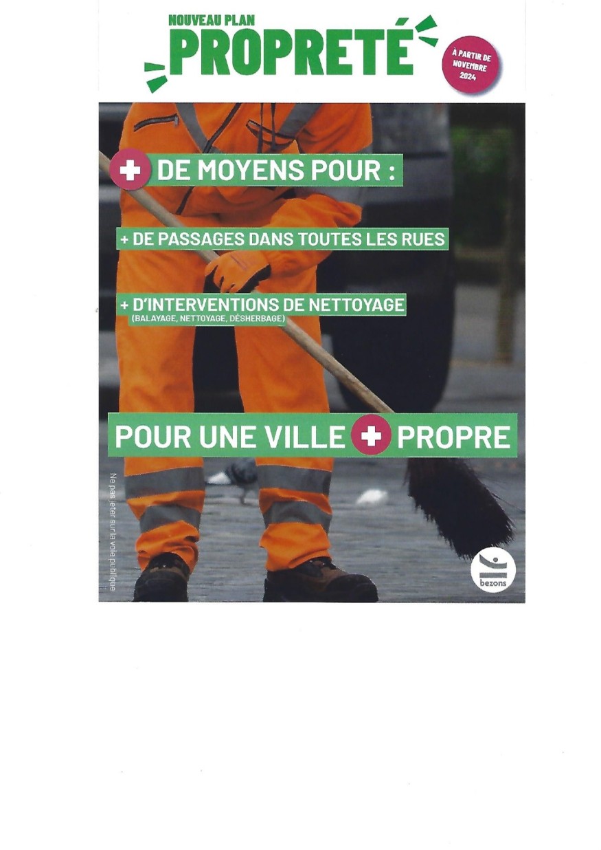 Ce matin, j'ai trouvé dans ma boîte aux lettres un document informatif sur le Plan Propreté de notre ville. Une initiative bienvenue qui met en avant l'effort collectif pour améliorer la propreté de nos espaces publics. Parmi les détails qui ont attiré mon attention, j’ai remarqué la mention « NE PAS JETER SUR LA VOIE PUBLIQUE », une phrase probablement ajoutée à la suite du couac lors de la foire de Bezons. Ce rappel simple mais important souligne l’importance du respect des espaces publics.