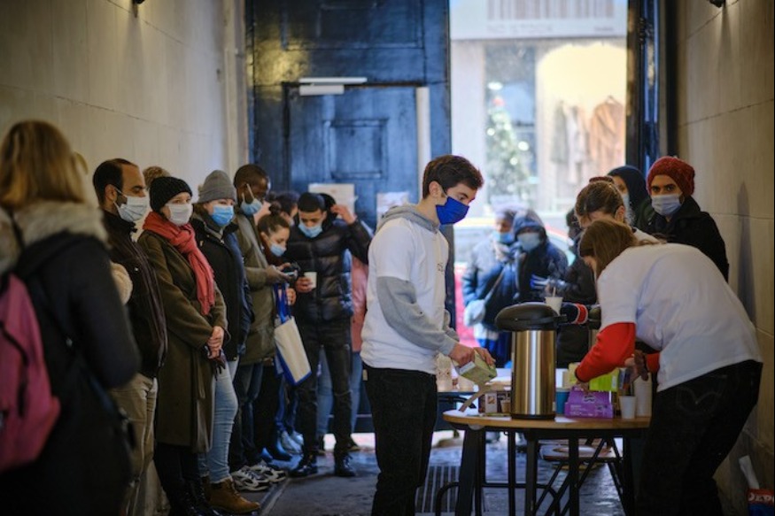 Cette association a été fondée par et pour des étudiants pendant le premier confinement afin de porter assistance aux étudiants dans le besoin. Elle distribue ce matin des colis alimentaires et des produits de première nécessité. Debout derrière une table de jardin, les bénévoles de l’association tentent de réchauffer l’ambiance en proposant du thé et du café. L’occasion d’échanger un premier regard, un sourire.